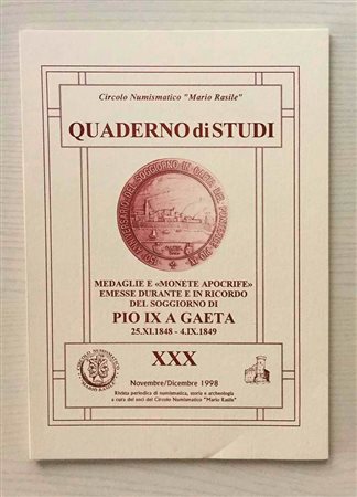 Circolo Numismatico “Mario Rasile” Quaderno di studi XXX, Formia, Novembre-Dicembre 1998. Medaglie e “Monete Apocrife” emesse durante e in ricordo del soggiorno di Pio IX a Gaeta 25.XI.1848- 4.IX.1849. Brossura ed., pp. 56, illustrazioni n/t. Nuovo