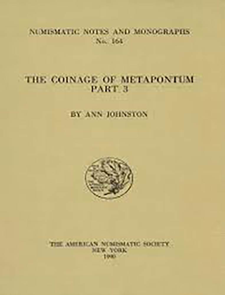 JOHNSTON A. - THE COINAGE OF METAPONTUM. PART 3. New York, 1990. matching yellow printed cloth. ix, 102 pages; 21 plates. Fine. Numismatic Notes and Monographs N. 164. by Johnston, along with a final new volume.
