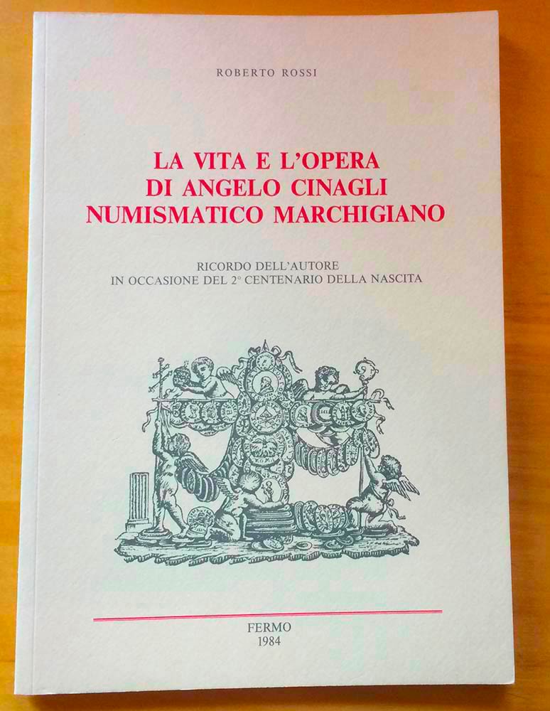 Rossi R. La vita e l'Opera di Angelo Cinagli Numismatico Marchigiano. Ricordo dell'autore in occasione del 2 centenario della nascita. Fermo 1984. Brossura ed. pp. 69, ill. in b/n. Buono stato