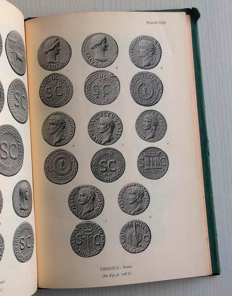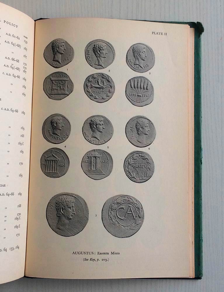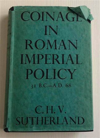 Sutherland C.H.V. Coinage in Roman Imperial Policy 31 B.C.- A.D. 68. London Methuen & Co. 1951. Cartonato ed. con titolo in oro al dorso, sovraccoperta, pp. 220, tavv. XVII in b/n. Strappo marginale alla sovraccoperta. Buono stato