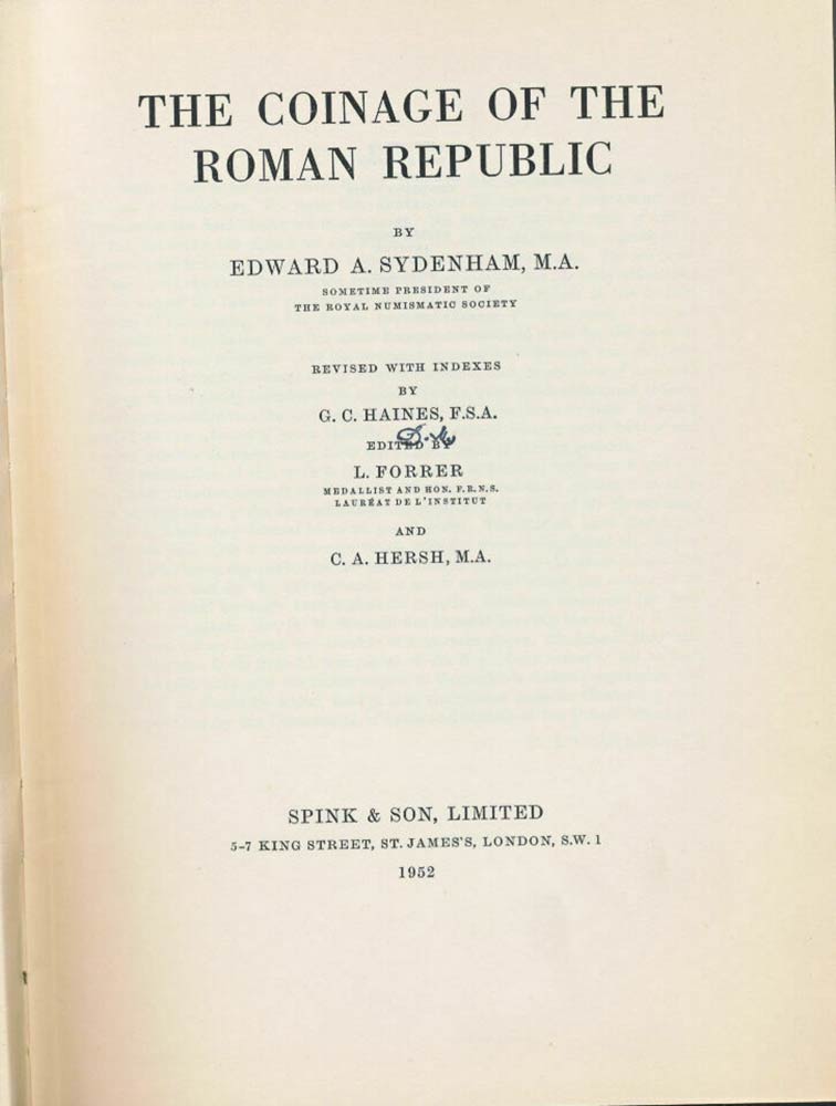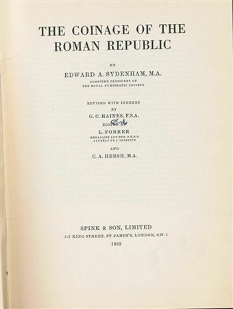 SYDENHAM Edward A. The Coinage of the Roman Republic. Spink, London, 1952 Cartonato, pp. 343, pl. 3