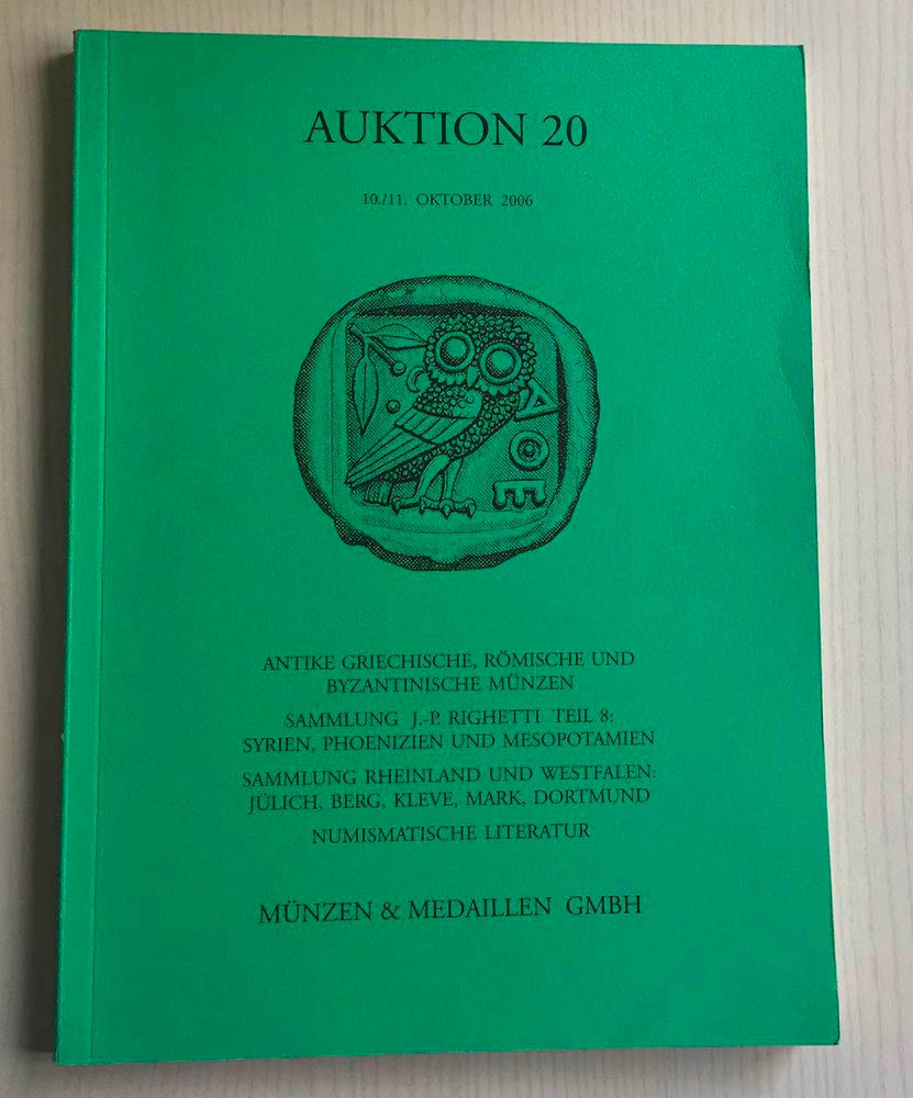 Munzen & Medaillen Auktion 20 Antike Griechische, Romische und Byzantinische Munzen, Sammlung J.-P. Righetti Teil 8, Syrien, Phoenizien und Mesopotamien, Sammlung Rheinland und Westfalen: Julich Berg, Kleve, Mark, Dortmund, Numismatische Literatur. 10-11 Oktober 2006. Brossura ed. pp. 208, lotti 1922, ill. in b/n. Ottimo stato.