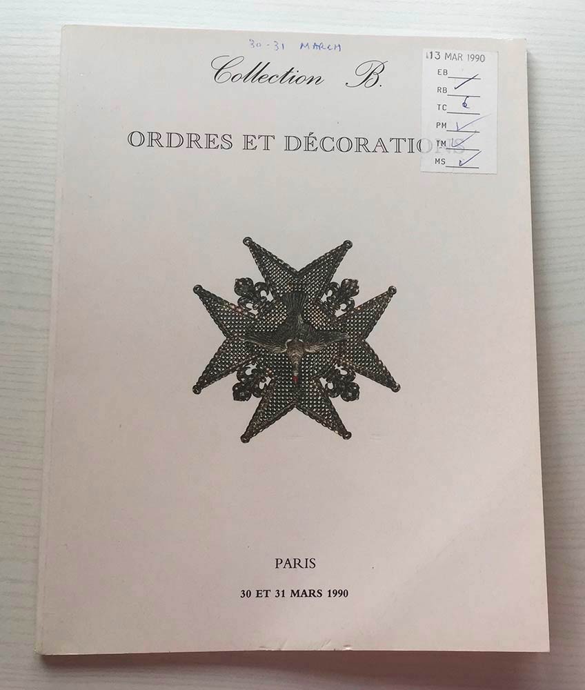 Platt M. Renaud M.D. Collection B. Ordres et Decorations. Paris 30-31 Mars 1990. Brossura ed. lotti 784, tavv. In b/n. Con lista prezzi di realizzo. Buono stato
