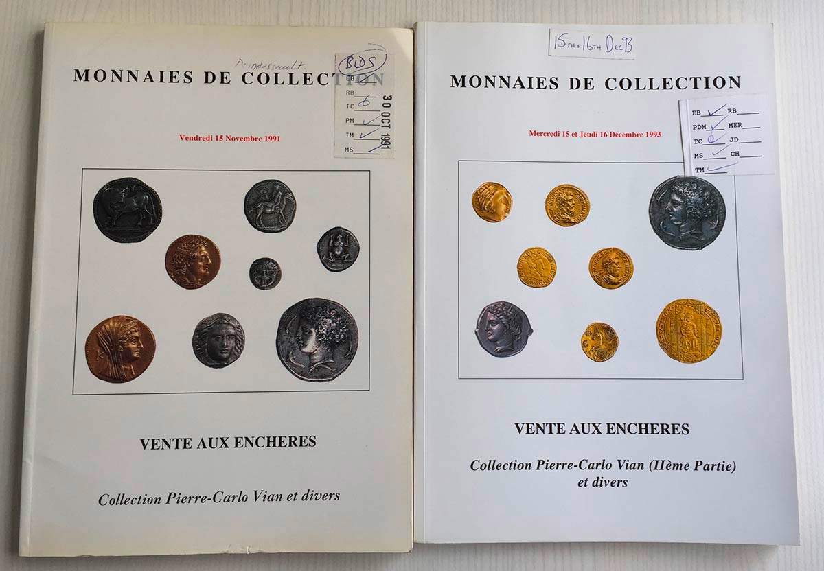 Poindessault B. Vedrines J. 2 Cataloghi. Monnaies de Collection. I Catalogo Collection Pierre-Carlo Vian et Divers. Paris 15 Novembre 1991. Brossura ed. lotti 887, ill. in b/n, tavv. 30 in b/n. 2 Catalogo Monnaie de Collection. Collection Pierre-Carlo Vian ( II Partie ) et Divers. Paris 15-16 decembre 1993. Brossura ed. lotti 613, tavv. 27 in b/n. Ottimo stato.