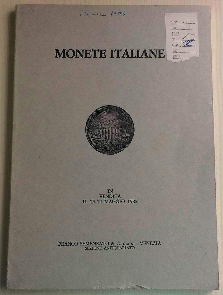Semenzato F. Monete Italiane Medioevali, Moderne, Contemporanee ed Estere. Venezia 13-14 Maggio 1982. Brossura ed. pp. 58, lotti 671, tavv. XLI in b/n. Con lista prezzi di stima. Buono stato