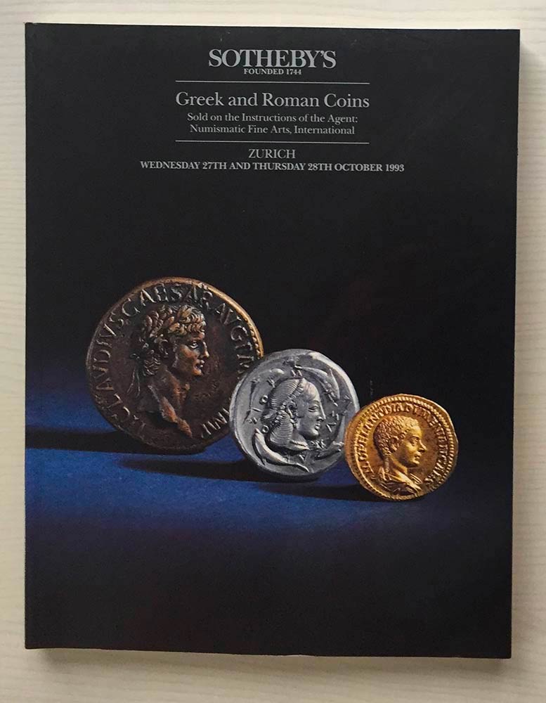 Sotheby's Greek and Roman Coins. Zurich 27-28 October 1993. Brossura ed. lotti da 157 a 1890, ill. in b/n e a colori. Buono stao