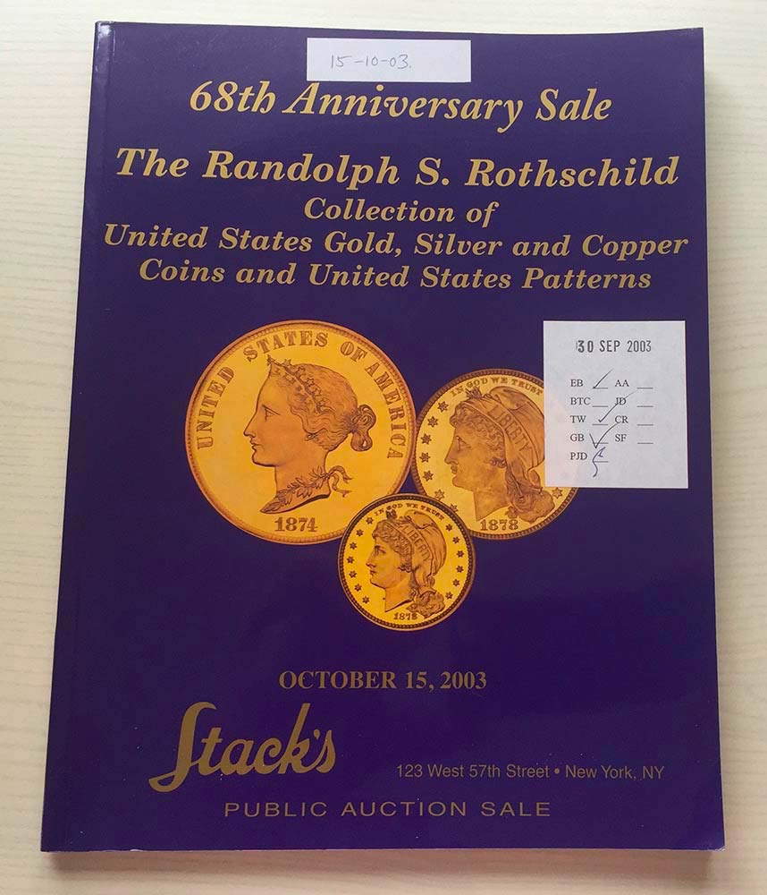 Stack's The Randolph S. Rothschild Collection of United States Gold, Silver and Copper Coins and United States Patterns. New York 15 October 2003. Brossura ed. lotti da 1001 a 1435, ill. in b/n, tavv 9 a colori, tavv. Di ingrandimenti a colori. Ottimo stato.
