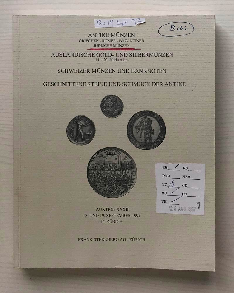 Sternberg F. Auktion XXXIII, Antike Munzen Griechen, Romer, Byzantiner, Judische Munzen. Auslandische Gold und Silbermunzen. Schweizer Munzen und Banknoten. Geschnittene Steine und Schmuck der Antike. Zurich 18-19 September 1997.