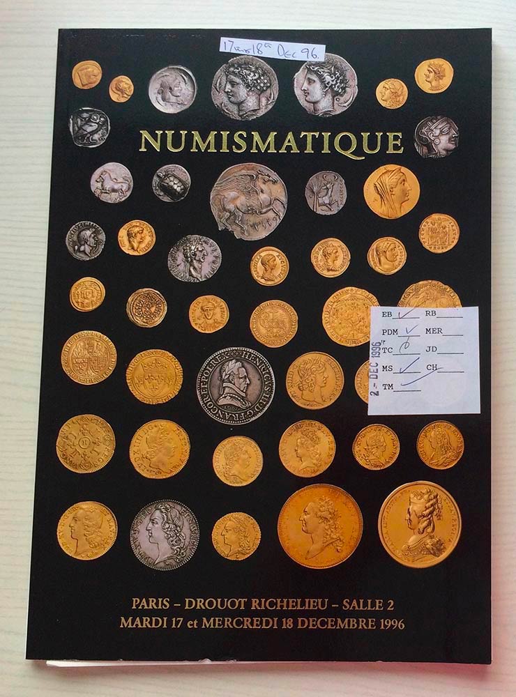 Vinchon F. B. Monnaies de Collection en Or, en Bronze. Grecques, Romaines et Byzantines, Celtes, Merovingiennes, Royales Francaises et Contemporaines, Etrangeres, Medailles. Paris 17-18 December 1996. Brossura ed. lotti 703, ill.
