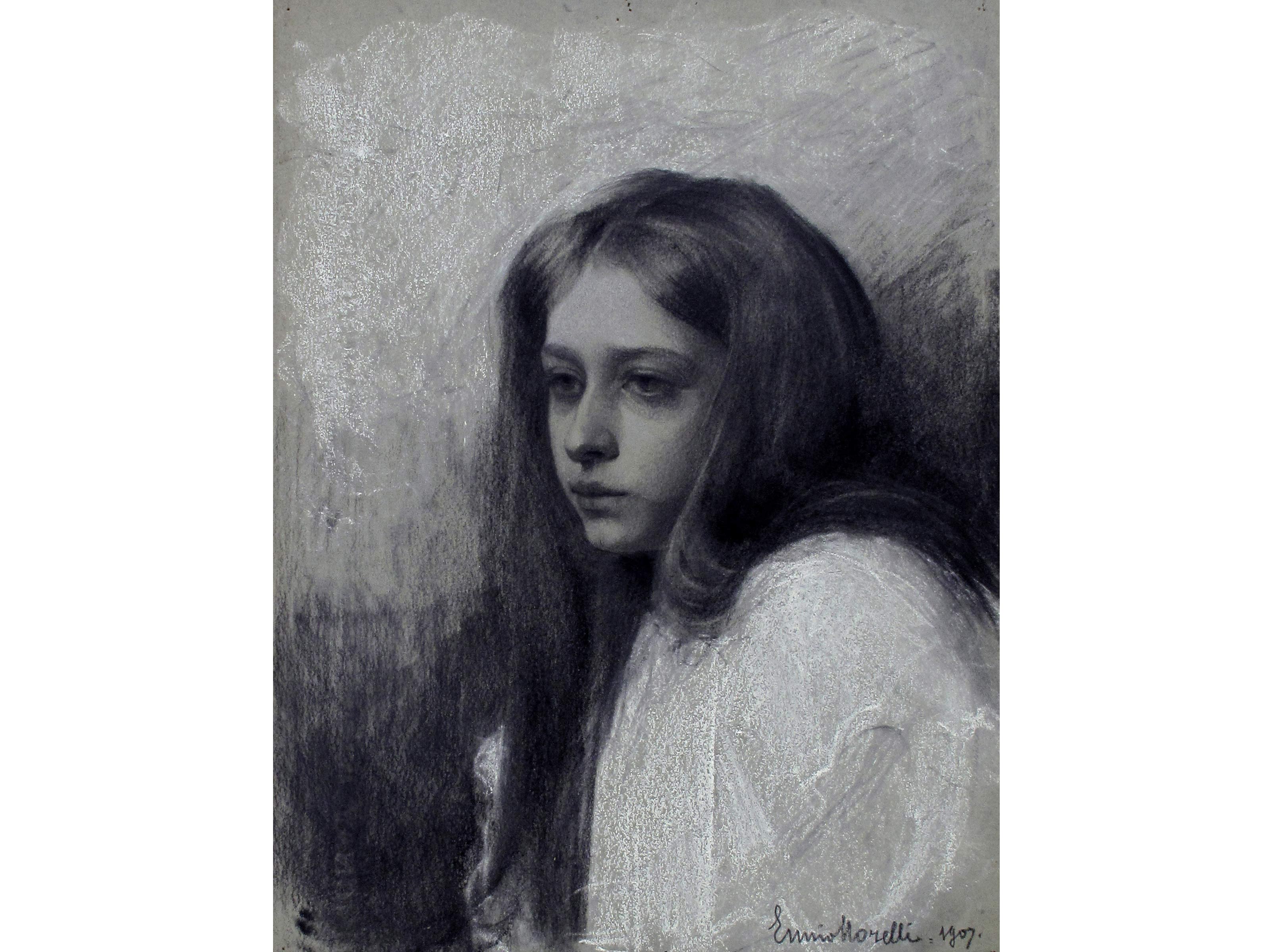 Ennio Morelli (Torino 1874-1941) Ritratto di bambina Matita su cartoncino Firmato e datato 1907 Misure 33x23.5 cm