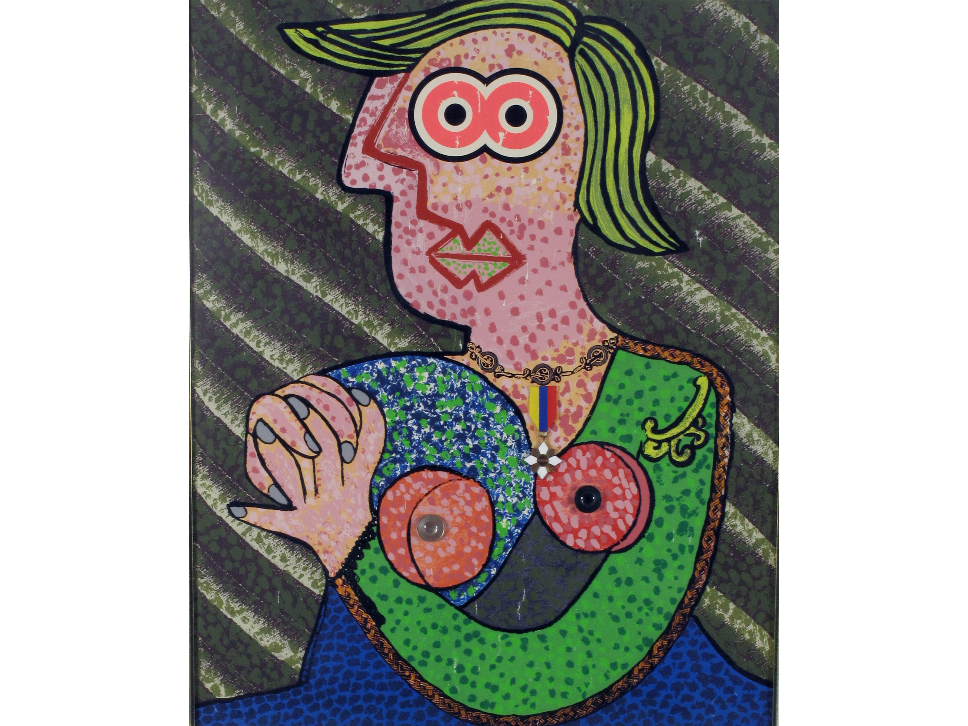 Enrico Baj (Milano 1924-Varese 2003) Matilde di Canossa Serigrafia su tela con applicazioni 479/1100 Firmato a tergo Misure 75x60 cm