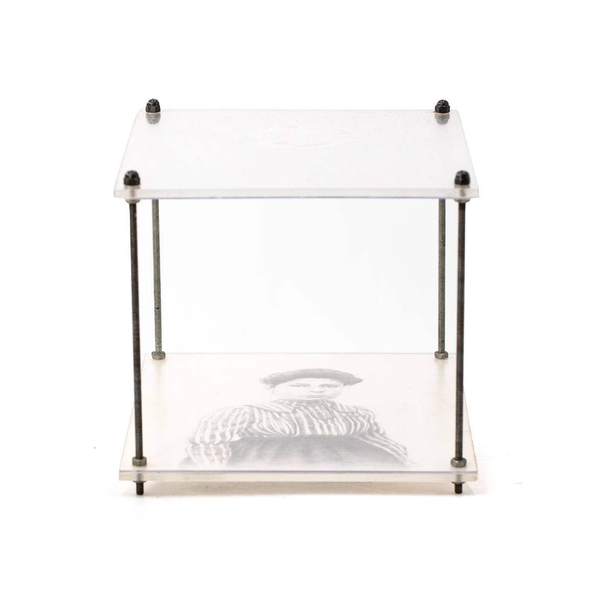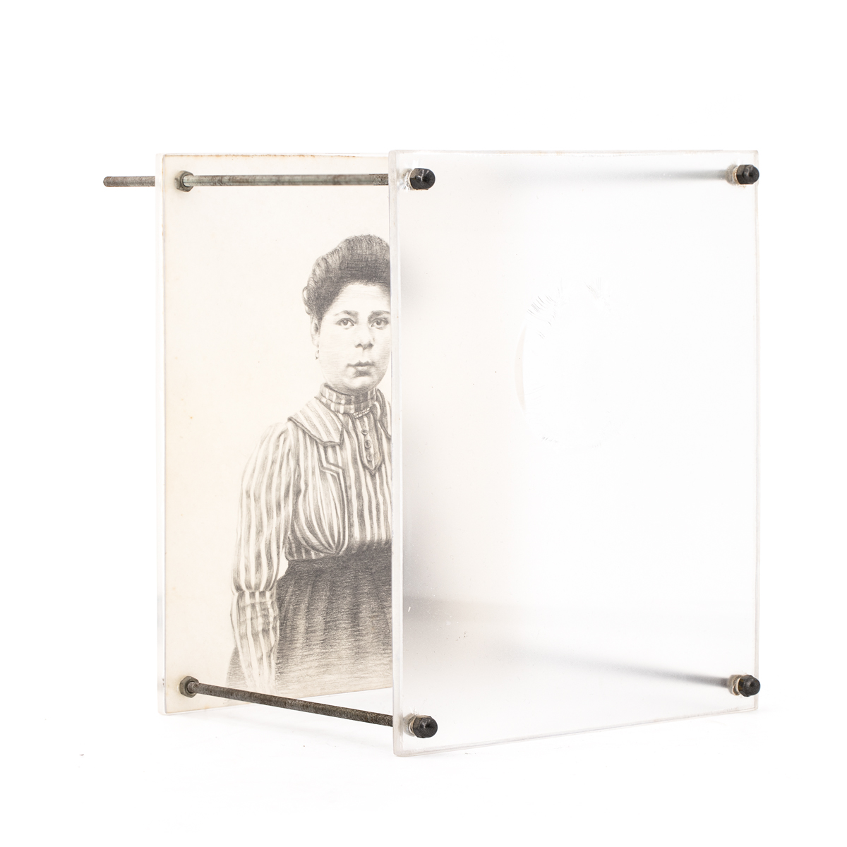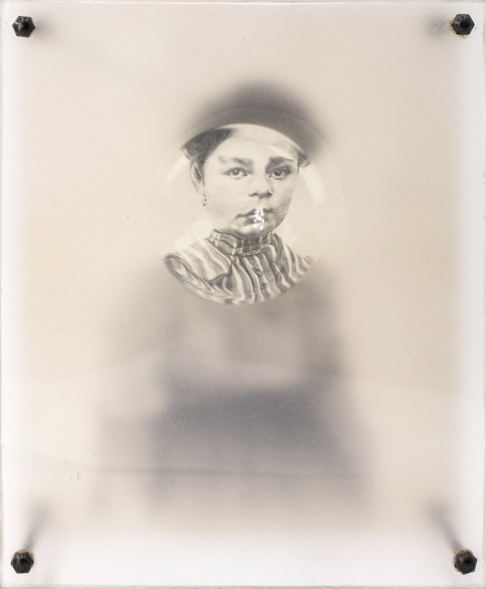 Assemblage composto da matita su carta e basterglass deformato posto frontalmente