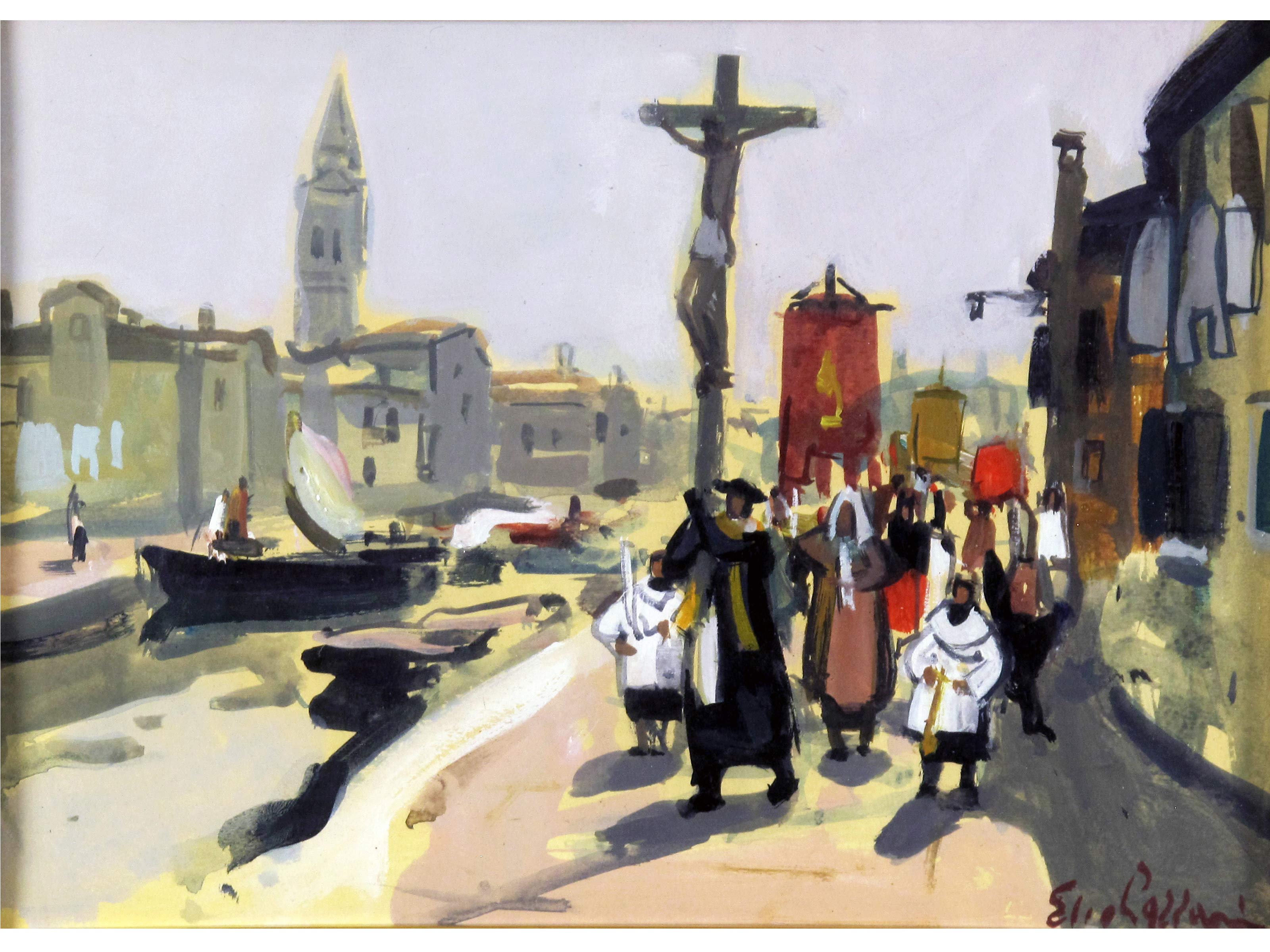 Elio Lazzari (Venezia 1942) Processione Tempera e olio su cartoncino Firmato Misure 23x33 cm