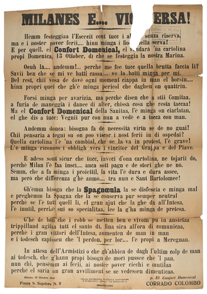 "Gh'èmm bisogn che la Spagnoeula la se disfescia e minga mal" Manifesto sfortunatamente attuale stampato dalla Società del Conforto Domenicale per promuovere una raccolta fondi per i soldati feriti e per i malati di Influenza Spagnola al termine del primo conflitto Mondiale. Scritto in dialetto meneghino, con tono ironico, si invitano i milanesi ad essere generosi e a donare i fondi "del rest, chii vosa de dovè ogni moment ciappà in man el borsin..hinn propri quei che gh'è minga pericol che daghen on quattrin.