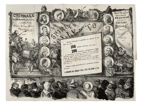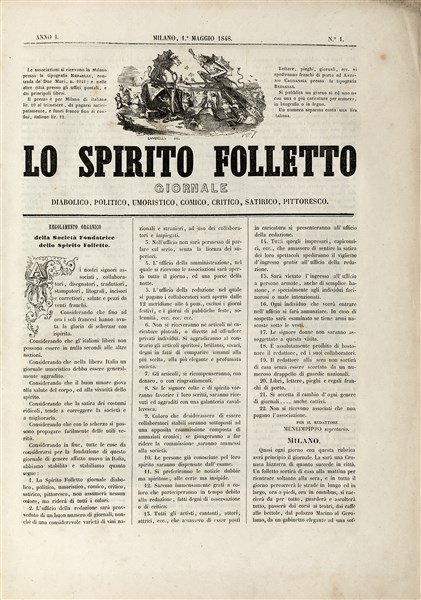 Straordinaria raccolta dello Spirito Folletto, giornale satirico fondato a Milano da Caccianiga il 1° maggio 1848 che comprende la prima rara annata terminata dopo 45 numeri con il ritorno degli austriaci. Il giornale riprese poi le pubblicazioni il 6 giugno 1861 con Sonzogno. Alla rivista, caratterizzata da una forte satira politica, sociale e anticlericale e riccamente illustrata da litografie, collaborarono i migliori caricaturisti dell'epoca, primo fra tutti Antonio Greppi e poi Camillo Marietti, Vespasiano Bignami, Gonin, Tofani, Frik e Lemot, Cremona e molti altri.