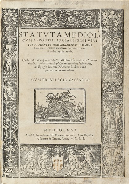 [STATUTI DI MILANO] - Statuta mediolani cum appostillis clarissimi viri iureconsulti mediolanensis domini. Milan: Giovanni Antonio Castiglione e Giovanni Battista Serono, 1552 (1550 al colophon).