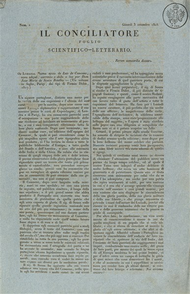 A collection of 116 issues of the Conciliator, the famous romantic and liberal newspaper. Among the collaborators are Silvio Pellico, Giovanni Berchet, Adeodato Ressi, Ludovico di Breme, Sismondi and many others financed by Luigi Porro Lambertenghi and Federico Confalonieri. The goal was to create a newspaper that gave space to modern ideas in all fields of knowledge which was not entirely appreciated by the Austrian censorship. The conciliator's experience ended on October 17, 1819 when pressure from the Austrian police on Pellico prompted the editorial staff to suspend publications and dissolve the company.