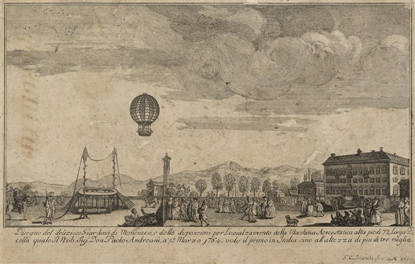 [AEROSTATICA - LUNARDI E ANDREOLI] - Una serie di documenti, avvisi e stampe fra cui l'incisione che illustra il primo volo di Don Paolo Andreani a Moncucco nel 1784 nel qual "volò il primo in Italia sino all'altezza di più di tre miglia". An interesting collection of documents and prints related to some of the first Italian hot air balloon ascensions