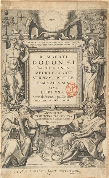 Folio (348 x 226mm). Engraved architectural title with figures of Theophrastus and Dioscorides, over 1,300 woodcuts in the text, Plantin's device on verso of final leaf, woodcut initials (without final blank, title with small loss in the margin, slightly shorter together with the second leaf, reinforced and mounted as the final two leaves of the first gathering, both slightly frayed in outer margin, some browning and spotting). Modern leather over marbled paper. Provenance: Henrici Rouven? (ownership note on title) - Bibliotheca chirurgica, Paris (red stamp on title) - Faculté de Medicine (stamp on verso of title) - K.U. ? L.B. (stamp) - Vittorio Arioli (bookplate).