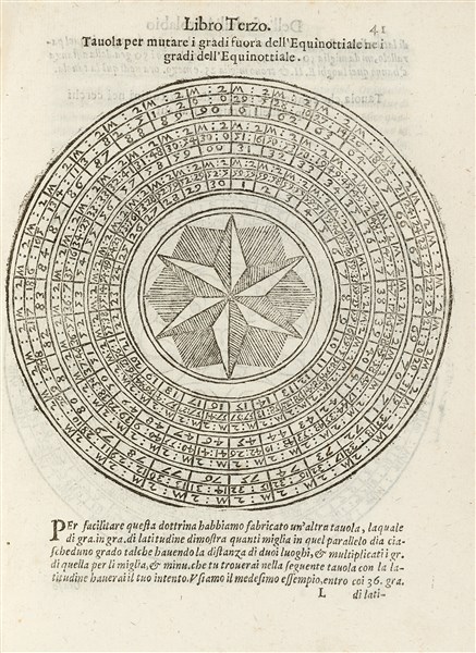 4to (205 x 114mm). Frontespizio inciso in rame entro cornice architettonica composta da strumenti scientifici con marca tipografica di Meietti (Gallo su trimonte) nella cornice, numerose illustrazioni xilografiche nel testo, alcune di grande formato e una tavola ripiegata, iniziali xilografiche, 2P1 con elementi sovrapposti girevoli al verso e recto, 2Q1r al verso (occasionali lievi fioriture, bruniture e qualche macchia di umidità, piccole tracce di tarlo al margine interno, 2P1 con piccolo buchino dovuto a un difetto della carta). Mezza pelle del XVIII secolo su piatti in carta marmorizzata, etichetta con titolo al dorso, tagli rossi (alcuni piccoli fori di tarlo al dorso, lievi graffi alle estremità, difetti alle giunture). Il numero di volvelle può variare a seconda della copia. Provenienza: Giovan Battista Borgo (antica nota di possesso al frontespizio).