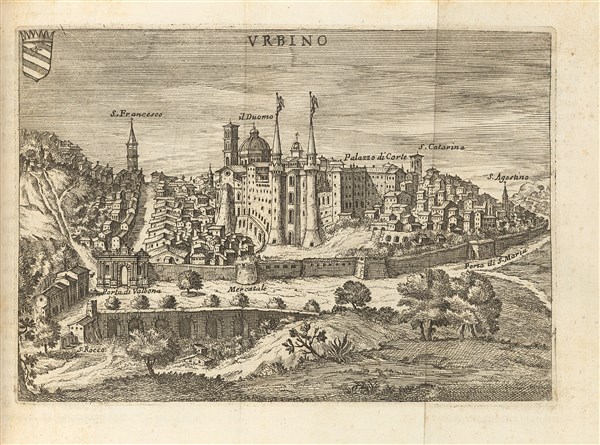 8vo (160 x 105mm). Engraved Borghese arms on title, woodcut initials and headpieces, 26 engraved folding plates (lacking engraved frontispiece, small paperflaw to plate of Urbino, occasional tiny wormholes, some light browning and foxing). Modern vellum, manuscript title on spine, preserved in modern paper case.