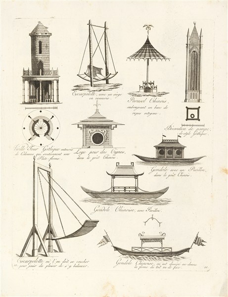 First Italian edition of this work dedicated to British gardens with numerous illustrations of pagodas, fountains, pavilions and furnishings that could not be missed in the romantic garden of a gentleman.