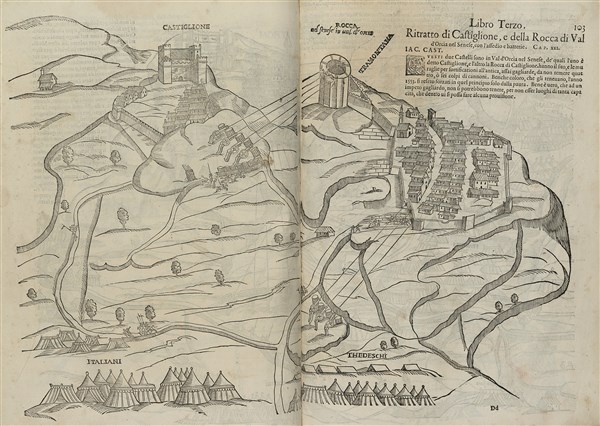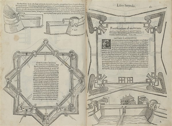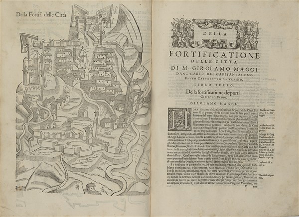 Prima edizione e copia dagli ampi margini di questo celebre trattato di fortificazione scritto da Girolamo Maggi, umanista e architetto, corredato da numerose illustrazioni di grande formato. Il primo libro è dedicato all'urbanistica, il secondo alle strutture da difesa in generale mentre il terzo alle fortezze "da mar": le fortificazioni marine e insulari di cui si serviva la Serenissima per controllare il Mediterraneo Orientale.