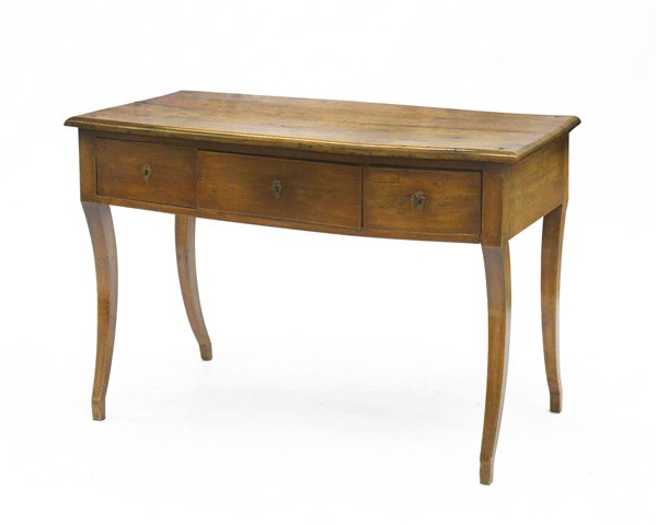 Antico tavolo scrittoio a tre cassetti nella fascia, gambe a sciabola (cm 120x8