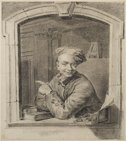The drawing reproduces in counterpart a famous self-portrait of M. Q. de La Tour, of which at least two painted versions are known. Our drawing is very close to the version engraved by Georg Friedrich Schmidt, a friend of La Tour.