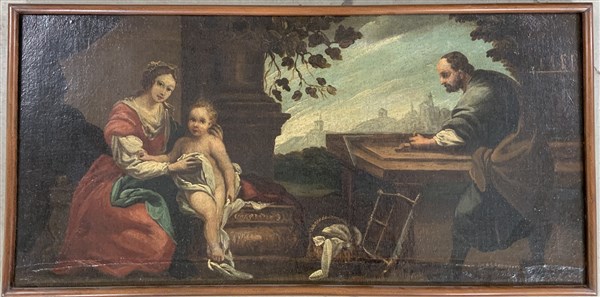 Ignoto "Sacra Famiglia con San Giuseppe al lavoro" antico dipinto ad olio su tela (cm 37x77) In cornice