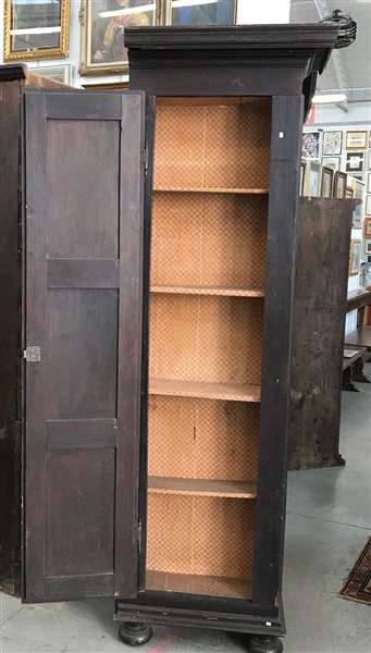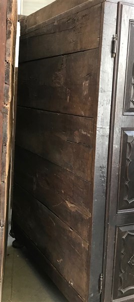 Armadio a due ante sul fronte e due laterali riquadrate e decorate da pannelli con sagome, cappello sagomato, piedi a cipolla (cm 174x250x72) Inciso all'interno di un'antina laterale "Giacomo Botineli fecce quest opera .... 1773" entro cartella (difetti e restauri)