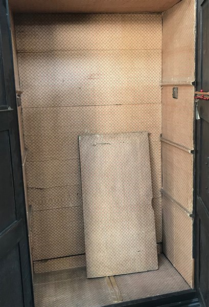 Armadio a due ante sul fronte e due laterali riquadrate e decorate da pannelli