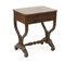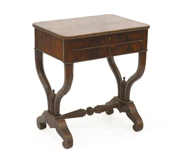 Tavolo da lavoro lastronato in mogano, piano apribile celante vani, cassetto nella fascia, gambe a lira riunite da traversa tornita. Secolo XIX (cm 63x74x45) (difetti)