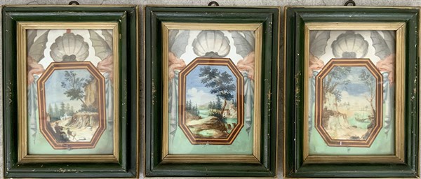 Ignoto del secolo XVIII "Paesaggi" tre dipinti a tempera su gesso (cm 16x12) In