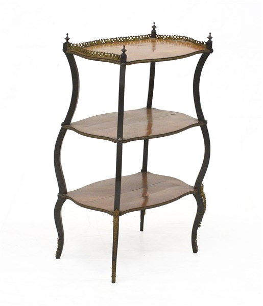 Etagère a tre ripiani decorati da fregi dorati, montanti ebanizzati terminanti