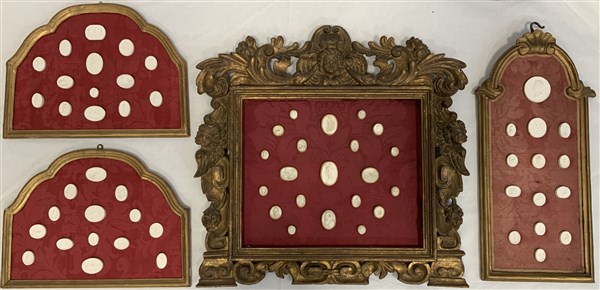 Collezione di numerosi medaglioni classici in gesso di epoche diverse contenuti in teche, una del secolo XVIII in legno intagliato e dorato scolpita a teste di cherubini decorate in policromia (difetti)