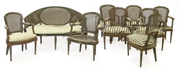 Fornitura da salotto composta da otto poltrone e un divano in legno laccato a fondo verde con fregi e profili dorati, fine secolo XVIII (difetti e restauri)