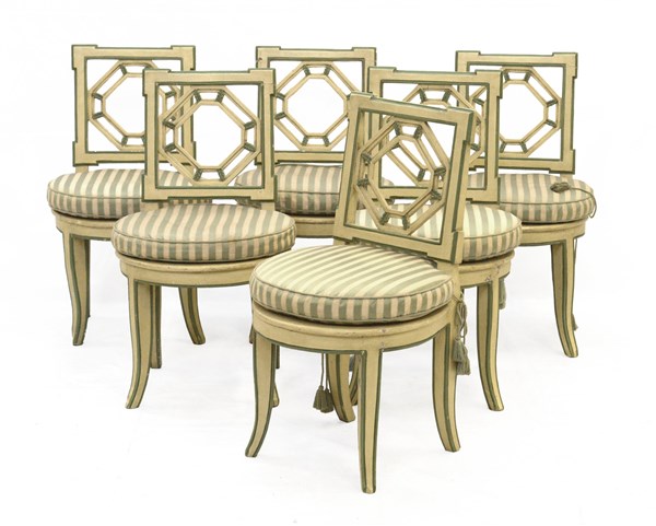 Gruppo di sei sedie basse in legno laccato con schienale traforato decorato a m