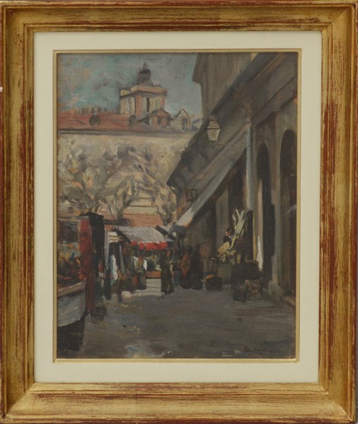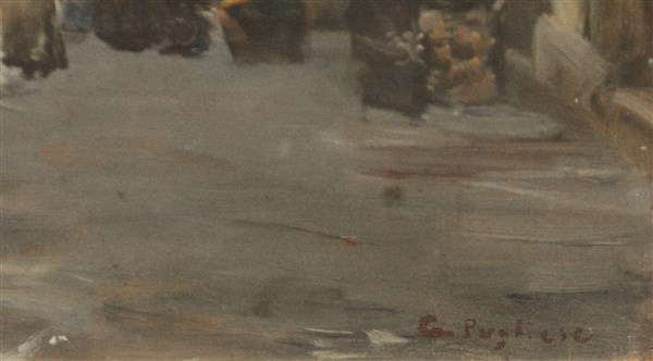 César Pugliese "Il mercato" olio su tavola (cm 36x27,5) Firmato in basso a dest