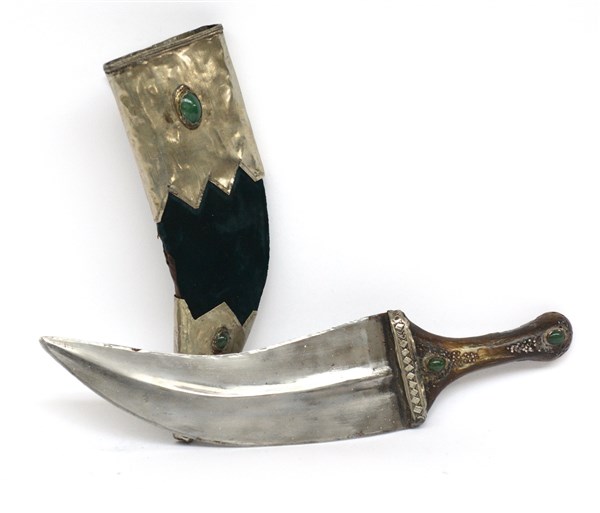 Jambiya arabo yemenita con impugnatura con parti in argento cesellato a forme geometriche. Lama tipicamente curva a doppio filo con costolatura centrale. Fodero in legno ricoperto di velluto all'esterno ed in pelle al retro arricchito da due parti di metallo argentato. Presenti su fodero ed impugnatura castoni portanti cabochon di pietra verde (giada nefrite).