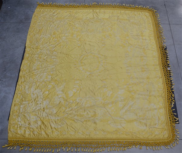 Copriletto in raso di seta gialla operato in giallo e bianco con motivi floreali. Frange in cordoncino di seta gialla (cm 257x220) (difetti)