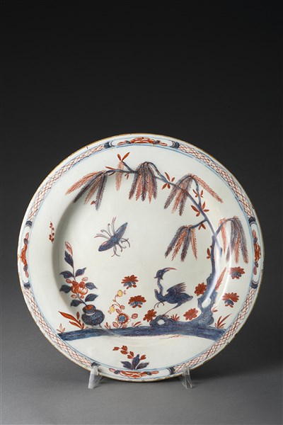 Piatto tondo in maiolica a bordo liscio con decorazione in blu e rosso ferro "allo struzzo". Milano, secolo XVIII (d. cm 22,5)