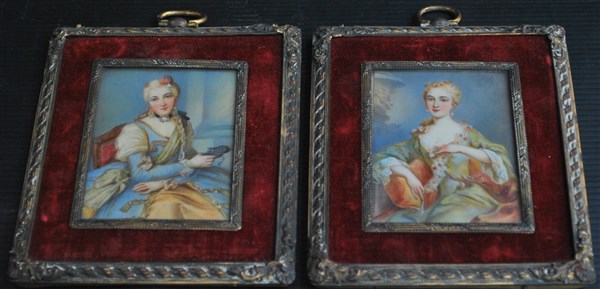Coppia di miniature raffiguranti gentildonne in abiti settecenteschi, in cornici in metallo dorato e velluto (cm 8x6,5) (difetti)