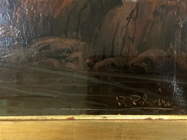 R. Poloni "Marina con barche e pescatori" olio su tela (cm 52x72) Firmato in bas