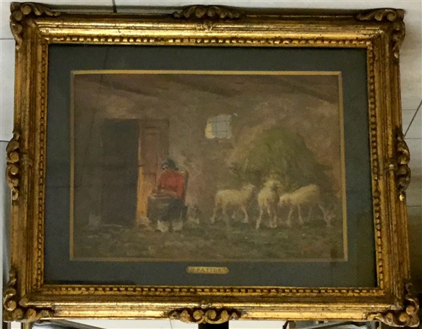 "Interno di stalla con contadina e animali" olio su tela applicata su cartoncino (cm 25,5x35,5) Firmato in basso a destra. In cornice