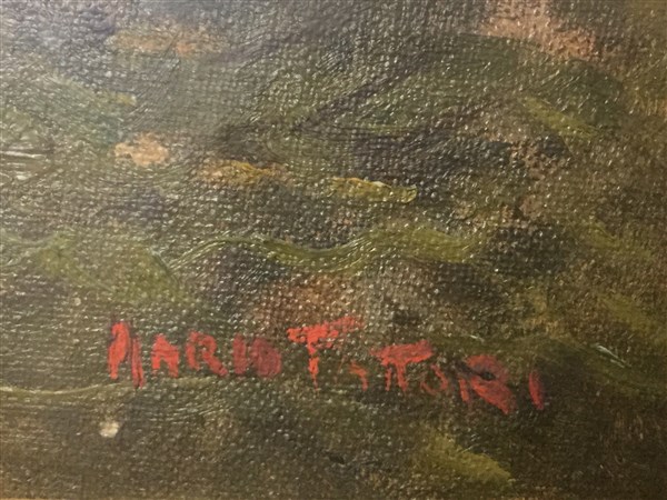 Mario Fattori "Interno di stalla con contadina e animali" olio su tela applicata