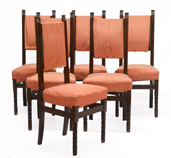 Gruppo di sei sedie in stile rinascimentale con gambe a torciglioni, sedute e s