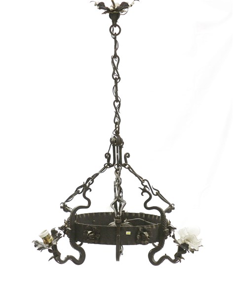 Lampadario in ferro battuto decorato con rosoni e fregi a sagoma a tre luci con