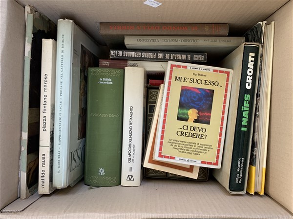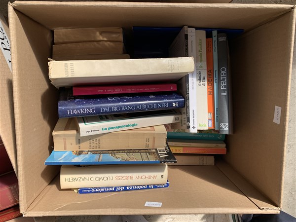 Lotto di 7 cartoni contenenti libri di argomento vario tra cui si segnalano l’enciclopedia delle scienze biologiche, testi di carattere filosofico spirituale, libri di yoga e meditazione