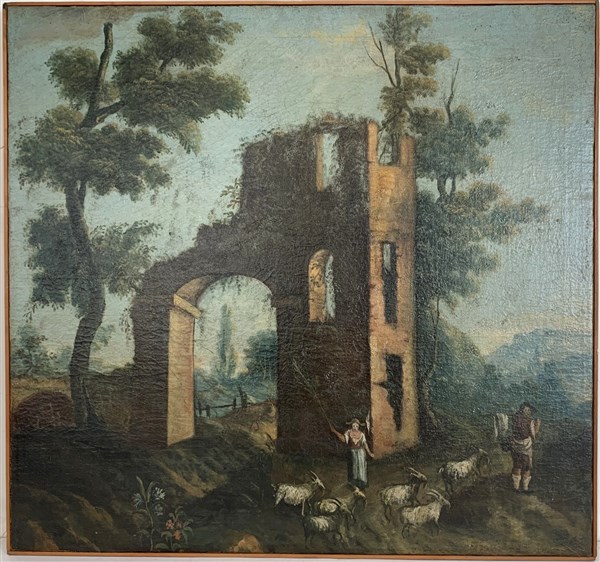 Ignoto "Paesaggio con pastori e armenti" antico dipinto ad olio su tela (cm 82x87) (difetti e restauri)